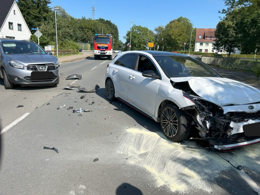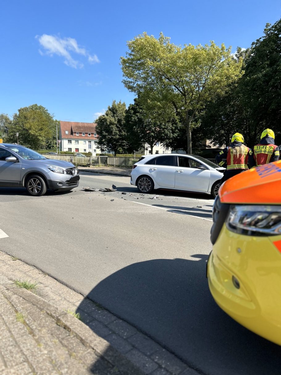 Während der Rückfahrt vom Einsatz der ausgelösten Brandmeldeanlage wurde die Feuerwehr Nordenham über Funk zu einem Verkehrsunfall gerufen. Vor Ort sicherten die Einsatzkräfte die Unfallstelle ab und nahmen auslaufende Betriebsstoffe mit einem Bindemittel auf.
