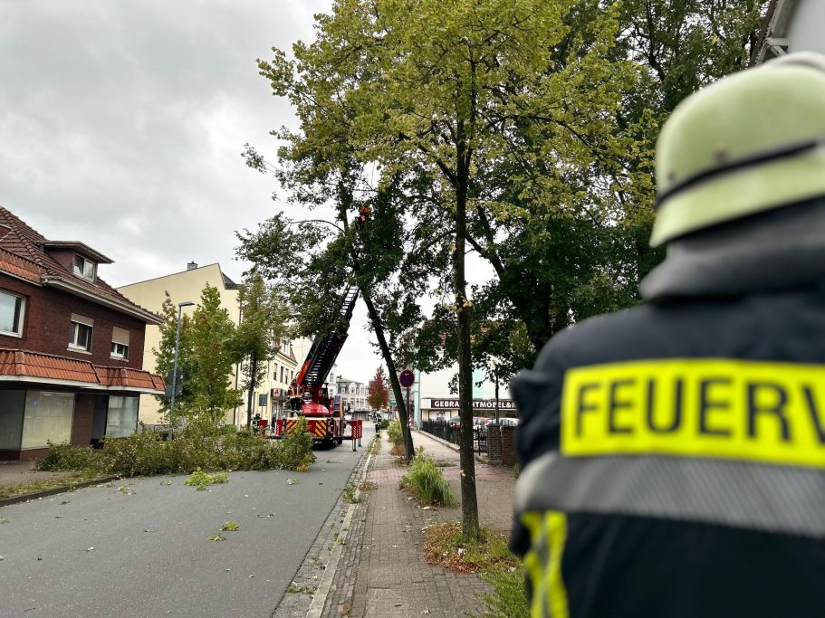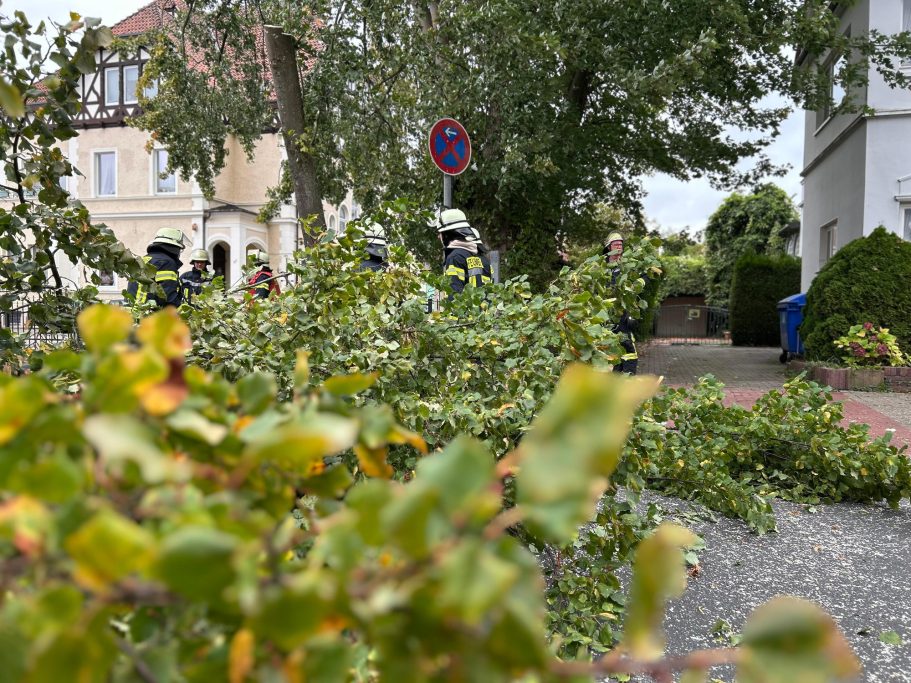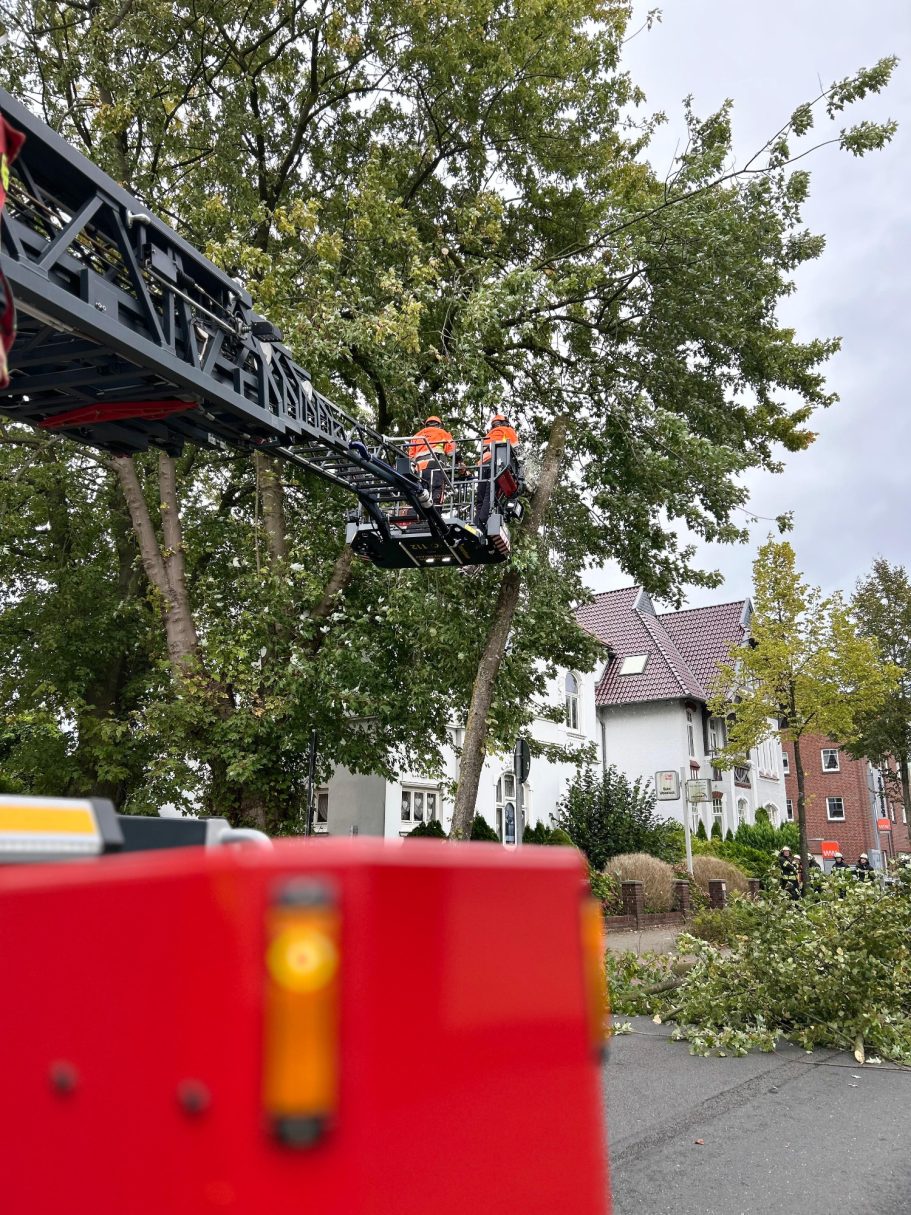 Um 17:02 Uhr wurde die Feuerwehr Nordenham zu einem Baum alarmiert, der drohte umzustürzen. Vor Ort sägten die Einsatzkräfte mithilfe der Drehleiter den Baum von oben ab, um weitere Gefahren zu vermeiden. Anschließend wurden die abgesägten Baumteile zur Seite geräumt.