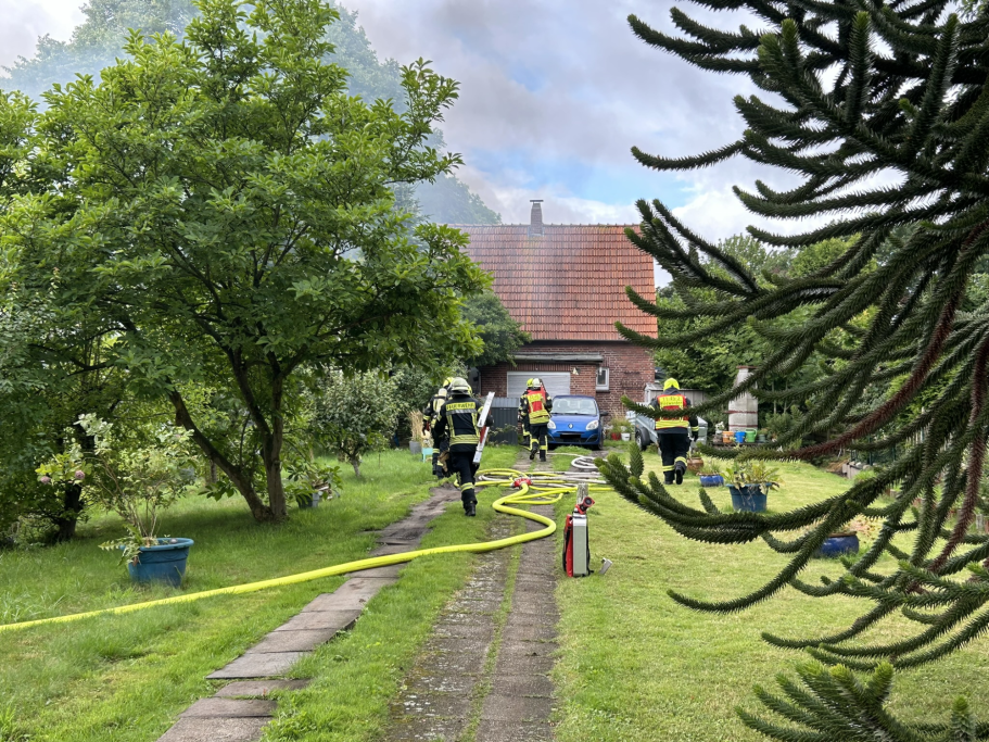 Um 10:53 Uhr wurde die Feuerwehr Einswarden, Blexen und Nordenham mit dem Einsatzstichwort "Brennt Haus" alarmiert. Vor Ort brannte ein Unterstand direkt am Gebäude. Durch das schnelle Eingreifen unter Atemschutz konnte ein Übergreifen auf den Dachstuhl verhindert werden.